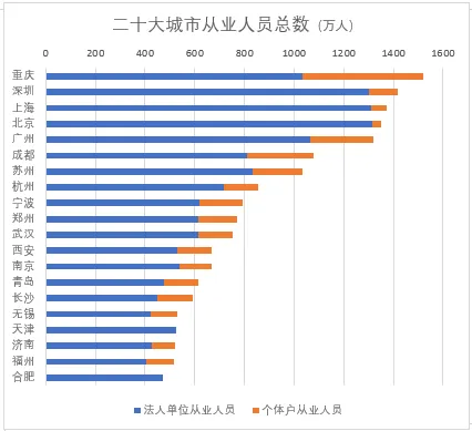 总体来看,由于法人单位的人效比明显高于个体经营户。法人单位从业人员数,和GDP总量之间的关系更强。在京沪深穗渝外,苏州和成都是仅有的两个法人单位从业人员数超过800万的城市。杭州是唯一一个介于700万到800万之间的城市。而宁波、武汉、郑州超过了600万。