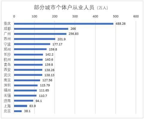 除天津、合肥外,二十大城市中另外18个的个体经营户从业人员如上图所示。总人口达到3000万的重庆,个体经营户从业人员接近500万,在所有城市中最多。除重庆外,个体经营户超过200万的城市仅有3个,分别是成都、广州和苏州。