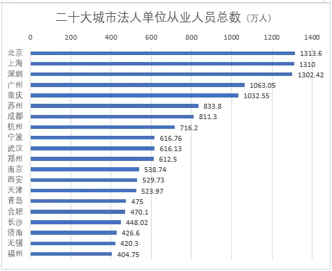 全国法人单位从业人员最多的城市依次是北京、上海、深圳、广州。这四个城市和重庆的法人单位从业人员总量超过了1000万。特别值得注意的是,北京、上海、深圳都在1300万出头的数量级,而广州和重庆在1000万到1100万之间,被前三个城市明显拉开了距离,反映出对“打工人”而言,这两个城市的就业岗位数量明显少于京沪深。